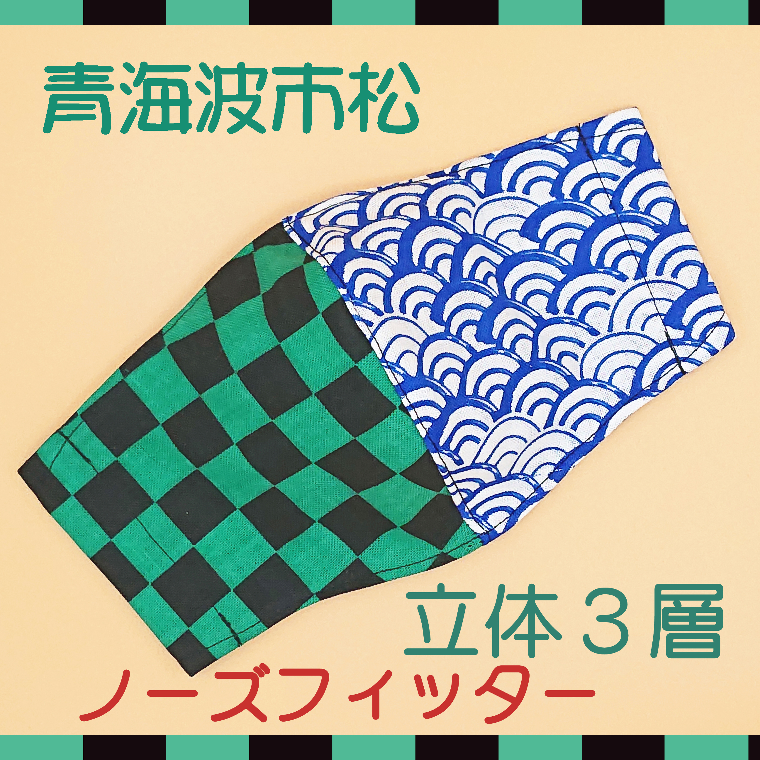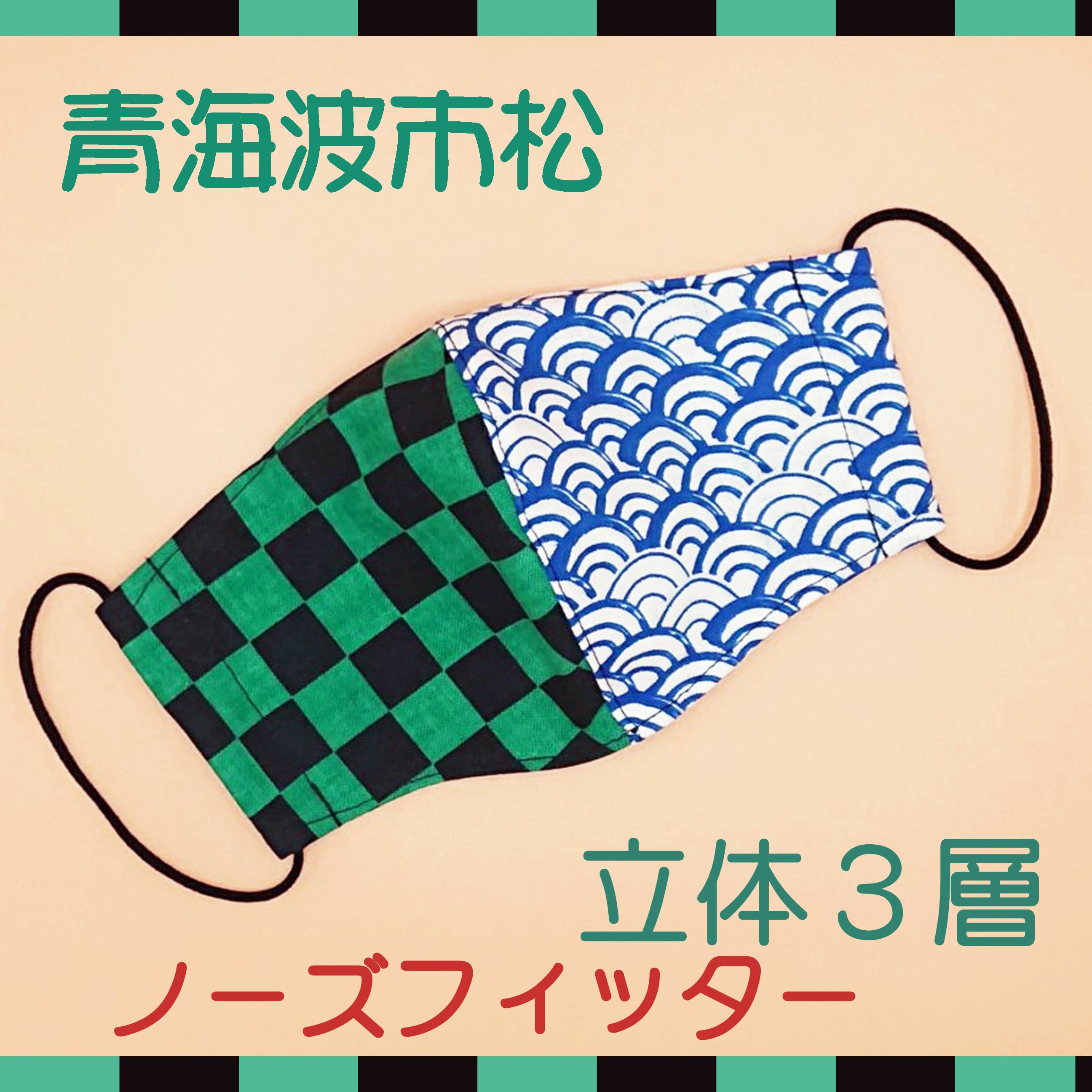立体マスク ★海原青海波/市松 グリーン★ 手ぬぐいマスク ●立体3層●ノーズフィッター●ポケット